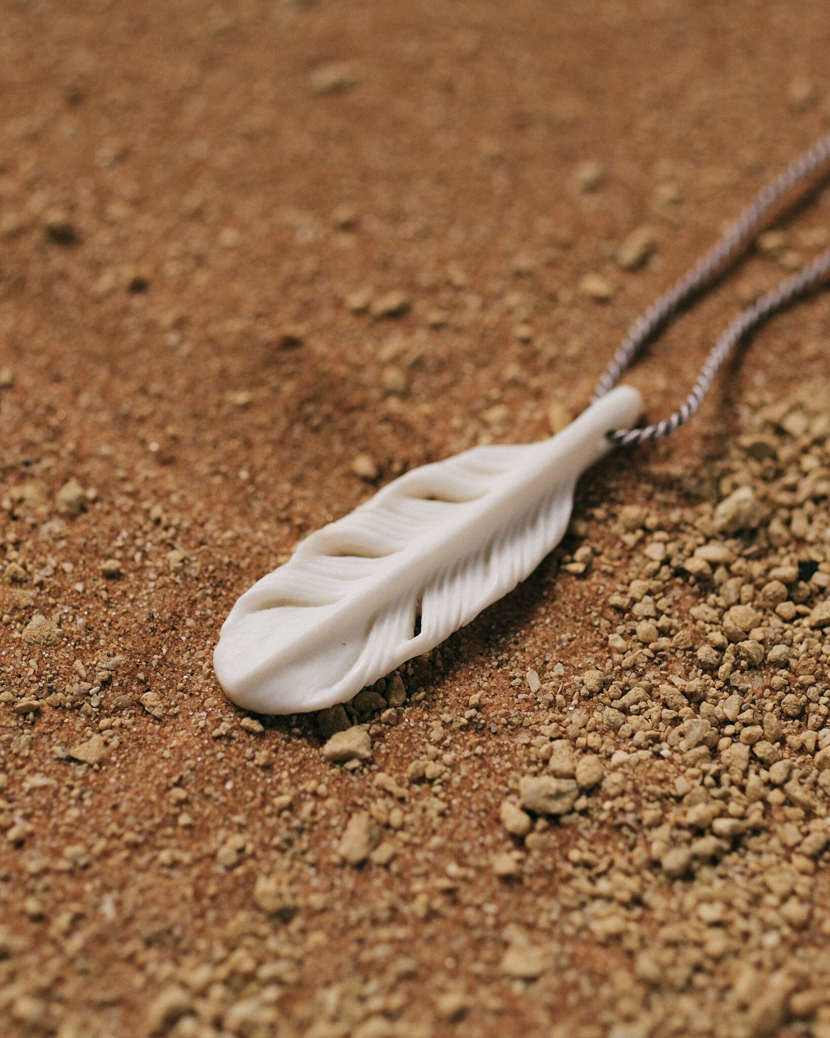 手作業で削り出したフェザーのトップをシルクの紐に通しペンダントにしました。素材は北海道のエゾシカの角。その中でも色や密度の良い物を選りすぐっています。