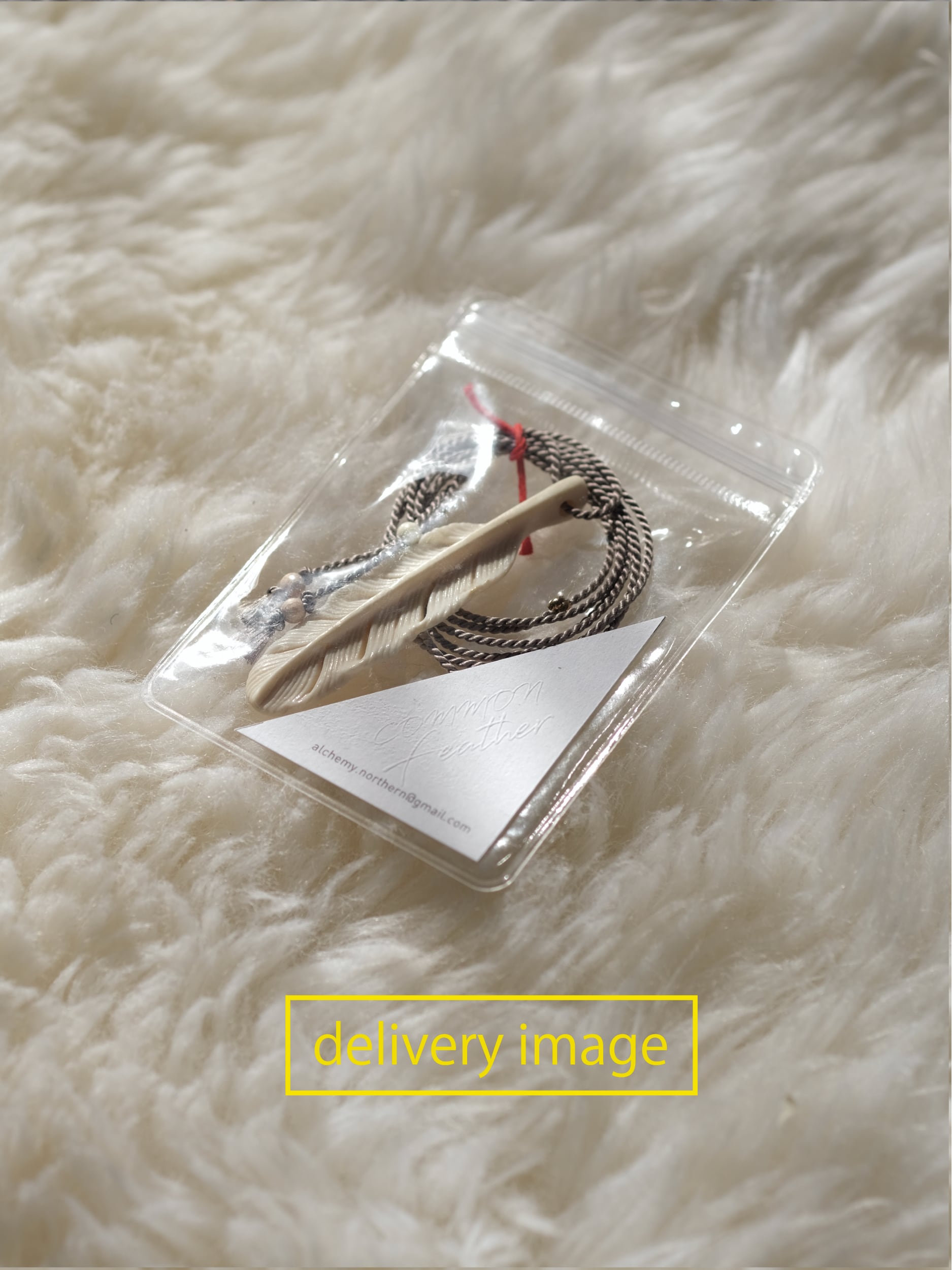 手作業で削り出したフェザーのトップをシルクの紐に通しペンダントにしました。素材は北海道のエゾシカの角。その中でも色や密度の良い物を選りすぐっています。