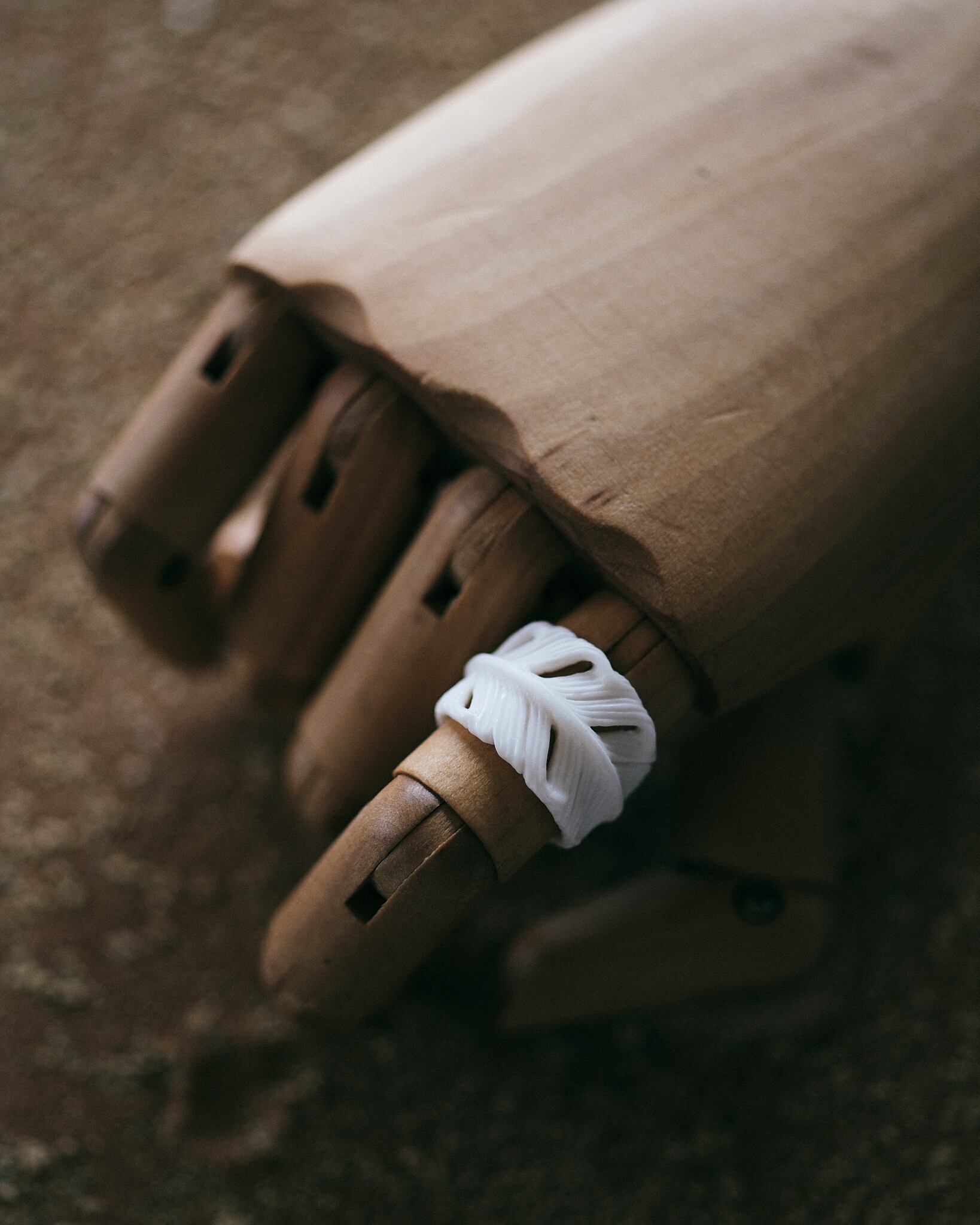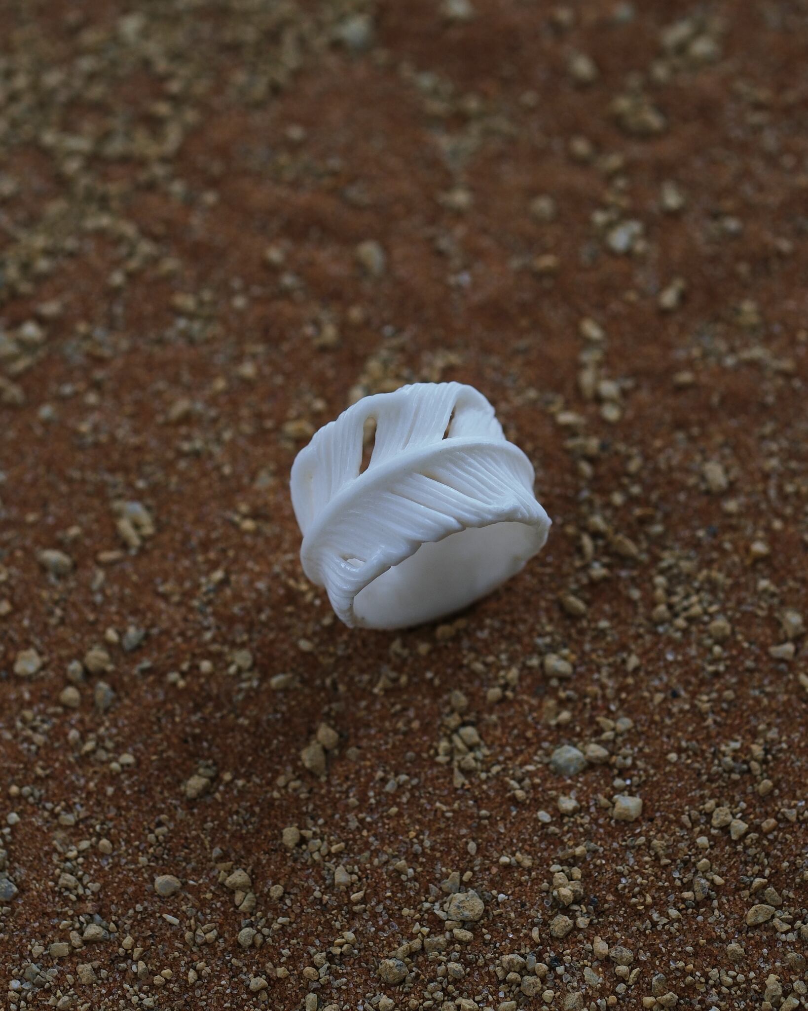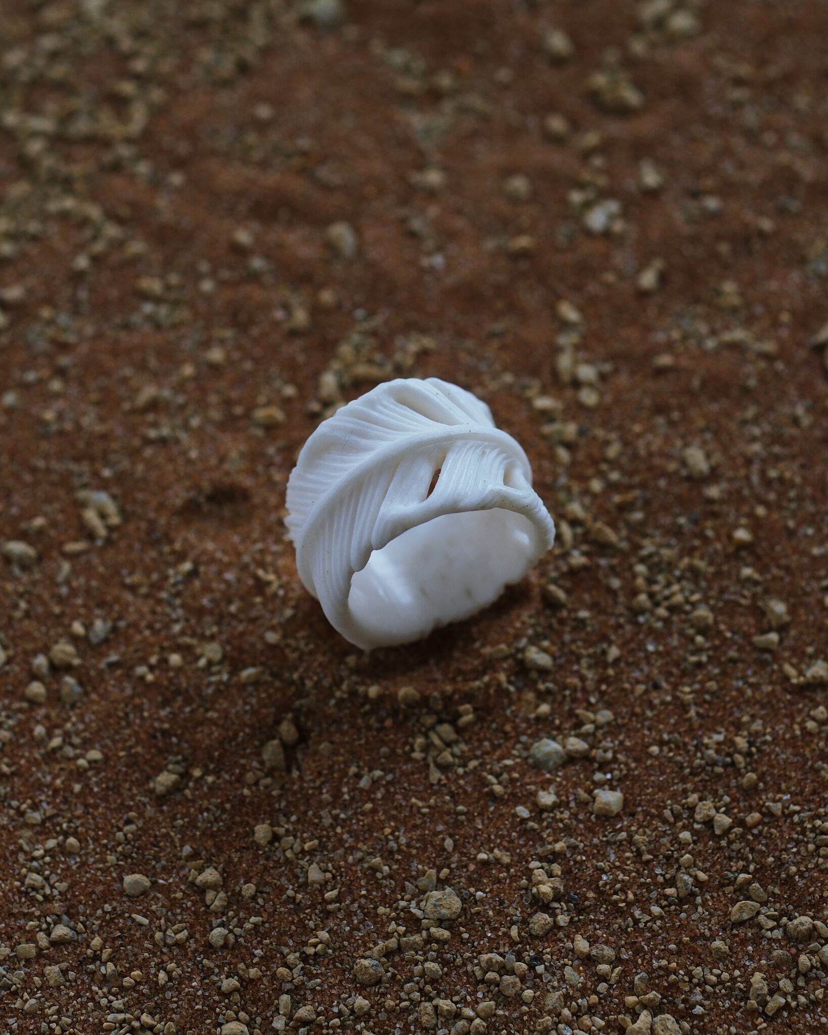 手作業で削り出したフェザーを指輪に。素材は北海道のエゾシカの角。その中でも色や密度の良い物を選りすぐっています。金属とは違った優しいつけ心地です。