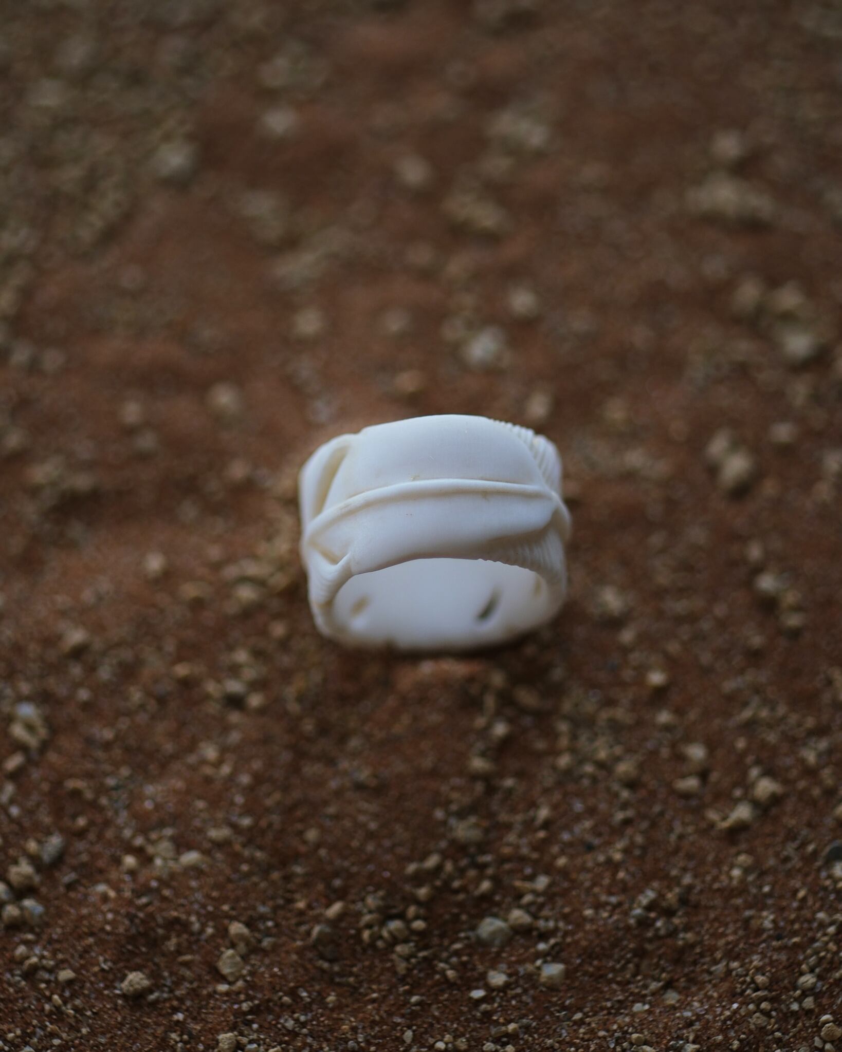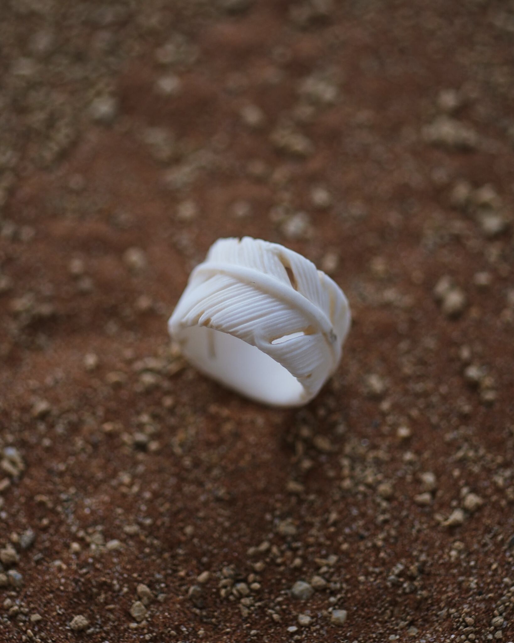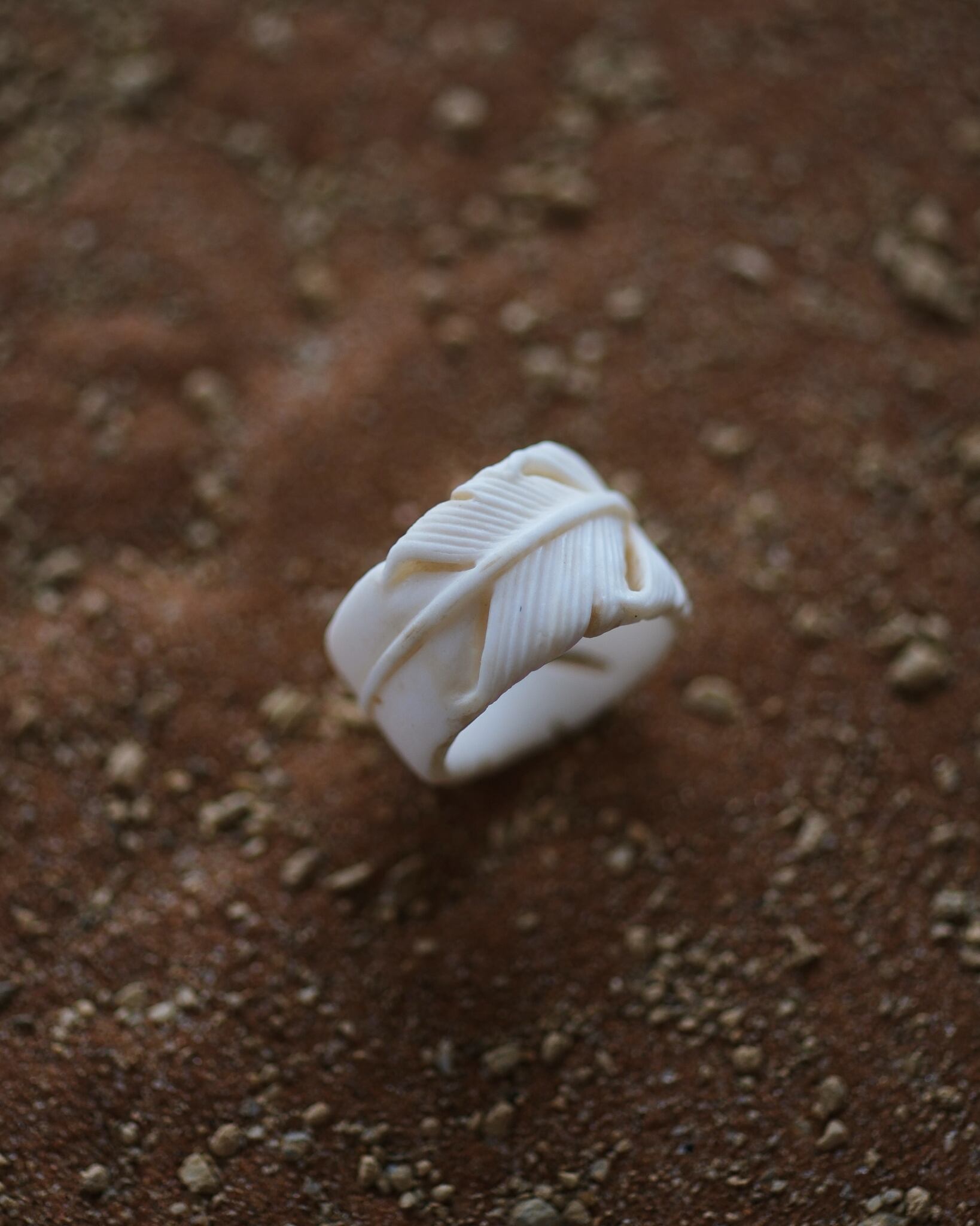 手作業で削り出したフェザーを指輪に。素材は北海道のエゾシカの角。その中でも色や密度の良い物を選りすぐっています。金属とは違った優しいつけ心地です。