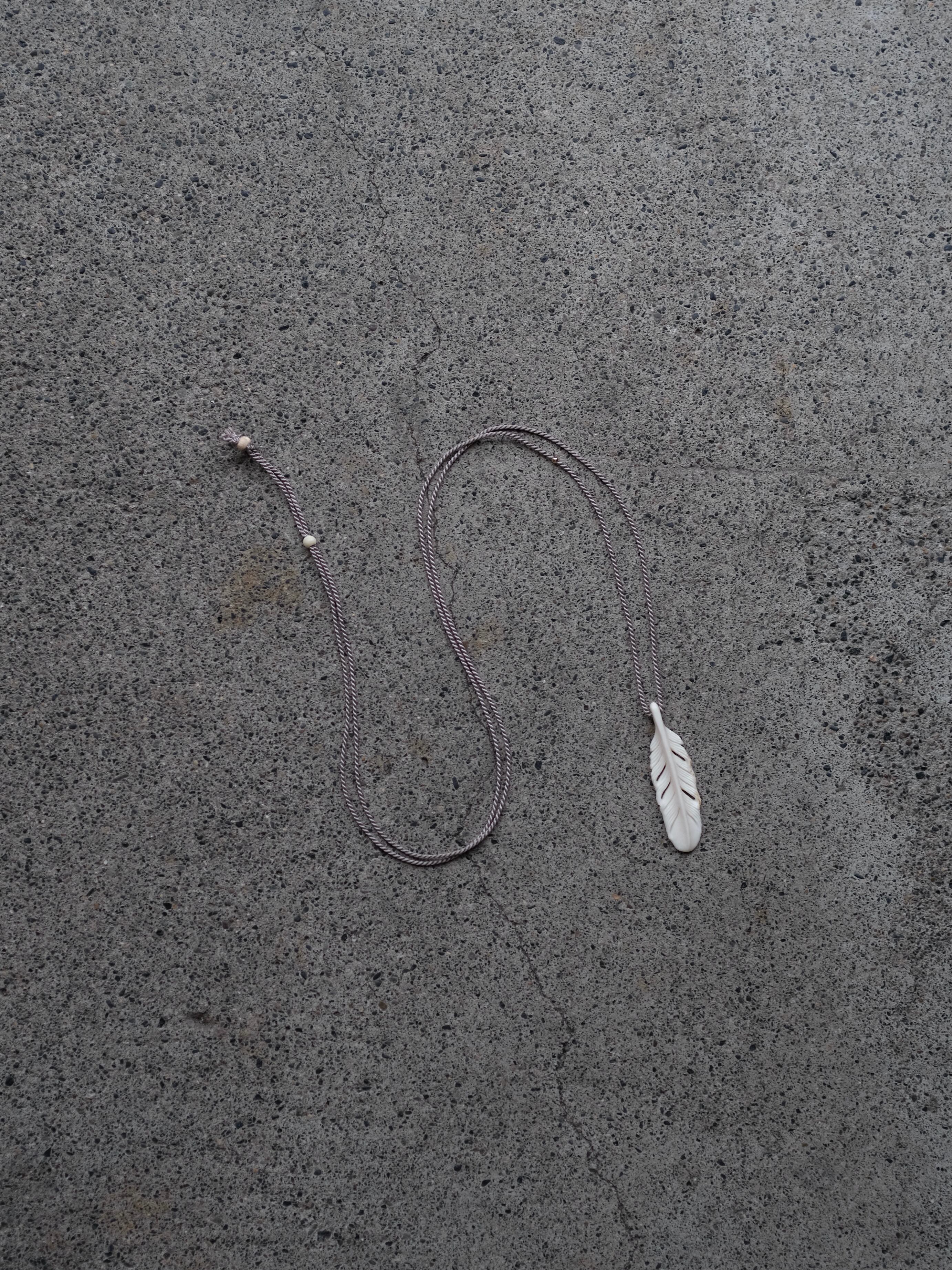 手作業で削り出したフェザーのトップをシルクの紐に通しペンダントにしました 素材は北海道のエゾシカの角 その中でも色や密度の良い物を選りすぐっています